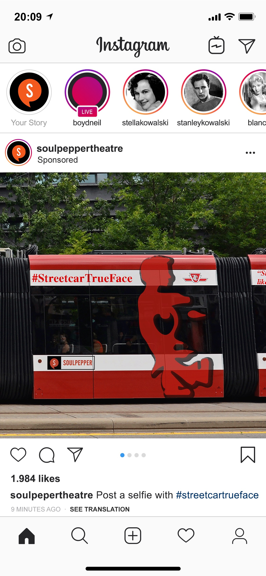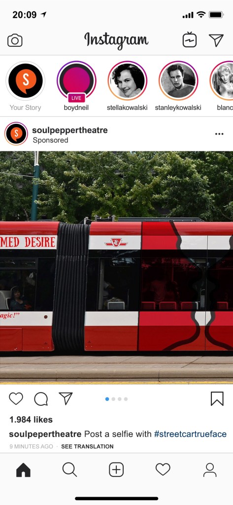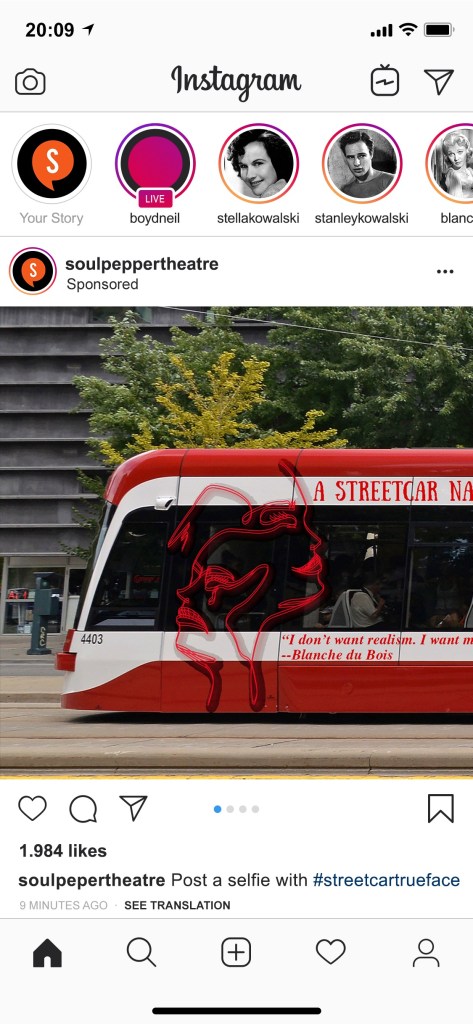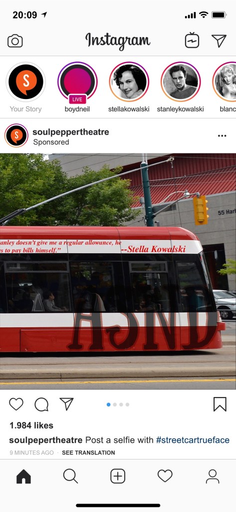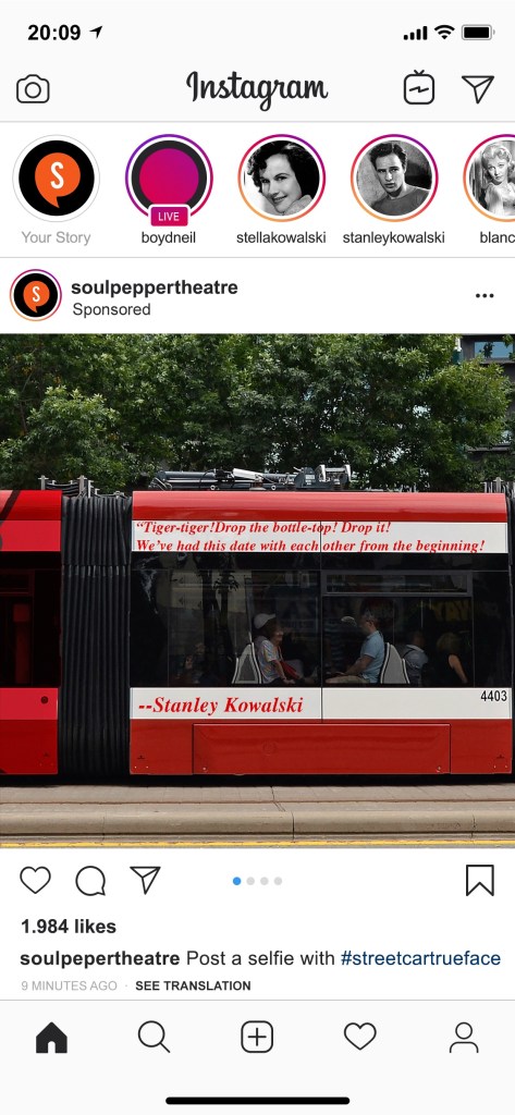 Soulpepper Theatre Company “A Streetcar Named Desire” Streetcar Takeover Instagram Post.